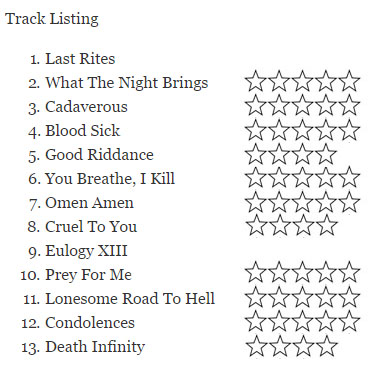 On Condolences one thing that really stood out to me was the overall production and whole band feel. This is the first album that Wednesday 13 has had the same band return to back him up. There is a real cohesion and chemistry with the current lineup and you can hear it executed with perfection. The drums are relentless and really hit with a force, the riffs push the tempo and there is even a few guitar solos dropped in here and there (a nice unexpected bonus). Topped off with Wednesday’s dark, twisted lyrical madness, Condolences is a heavy hitter and catchy as hell. These songs have been stuck in my head non-stop and I am sure people out and about think that I’m insane as I repeat them.